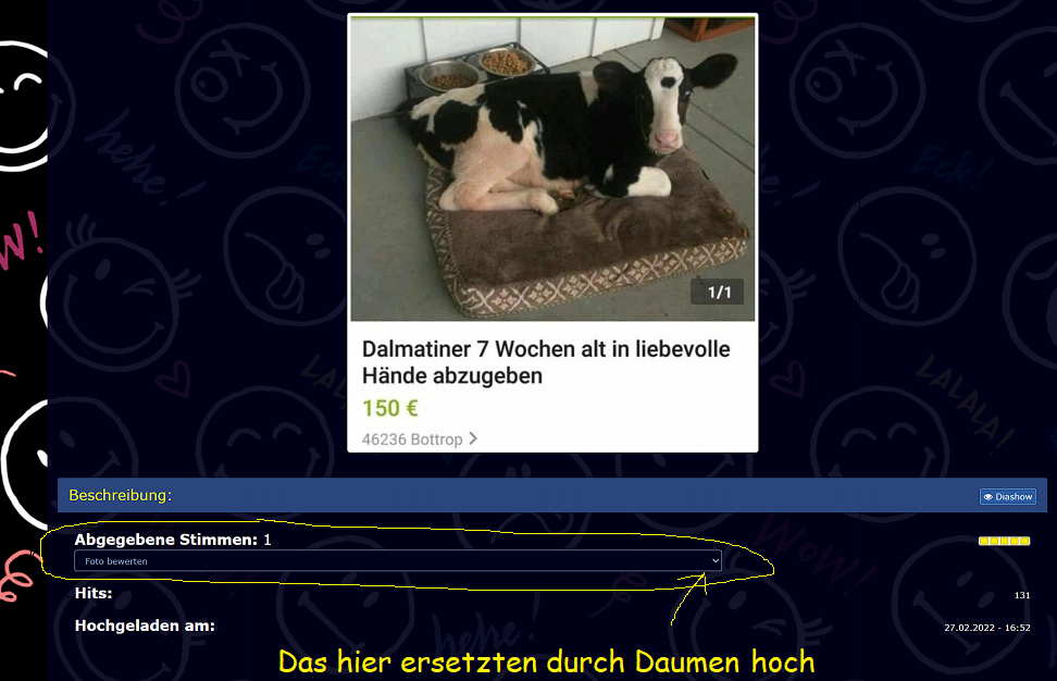 Ich benutzte die Fotogalerie auch schon in der V2 5 Jahre auch da hatte ich schon mehrere Tausend Lustige Bilder, jetzt noch weit mehr, dass die Leute die Bilder anschauen kann man ja in der Statistik sehen, doch bewerten tut kein Mensch, nach vielem Feedback und vielen Benutzerfragen, die ich gestellt hatte, gab es immer nur ein Ergebnis, es ist zu umständlich und kompliziert für so gut wie alle Benutzer die meine Seite besuchen.